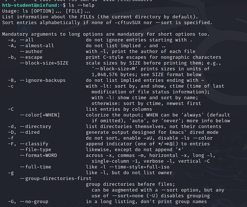 For this, we know we can use ls to list the file by doing ls /etc/sudoers/. But we don’t know how we can use ls to list the files along with their index numbers. Let’s use the help option to see how we can list their index numbers: